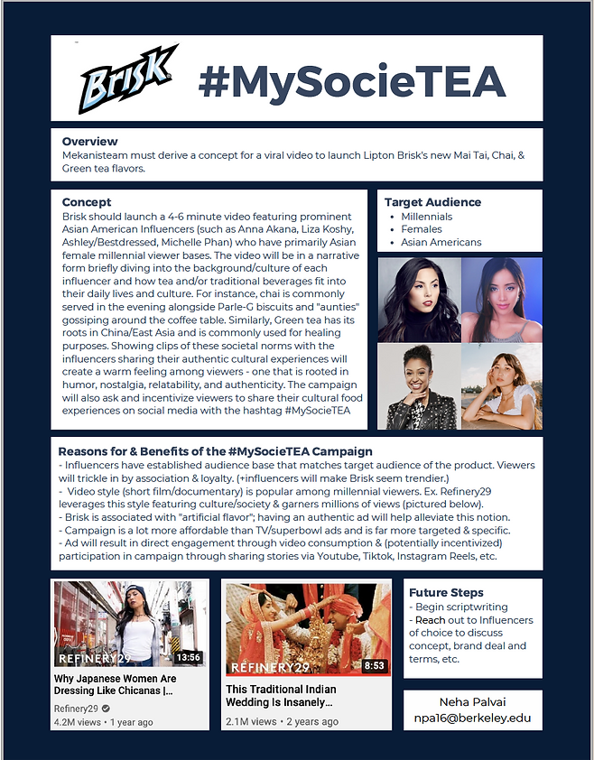 Brisk is revamping the brand by getting “sweet, spicy, and tangy” with its three new flavors: Mai Tai, Chai, and Green. They are looking for a new creative direction and viral video concept to introduce Millennials, Females, and Asian Americans to their new products.